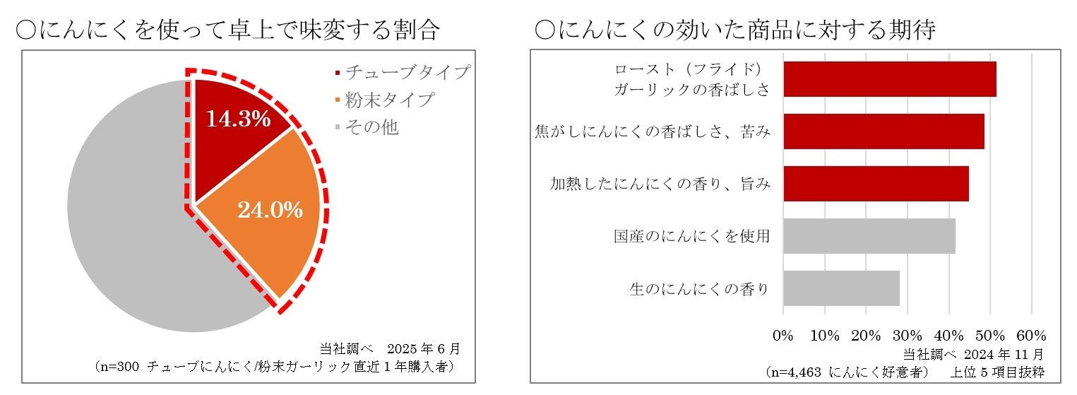 4割近くのお客さまが、チューブもしくは粉末タイプのにんにくを使って、卓上で料理の味を変えていることが分かります。また、にんにくが効いた商品に対しては、「ロースト(フライド)」や「焦がし」などの加熱したにんにくの香りや旨みへの期待が多く挙げられています。