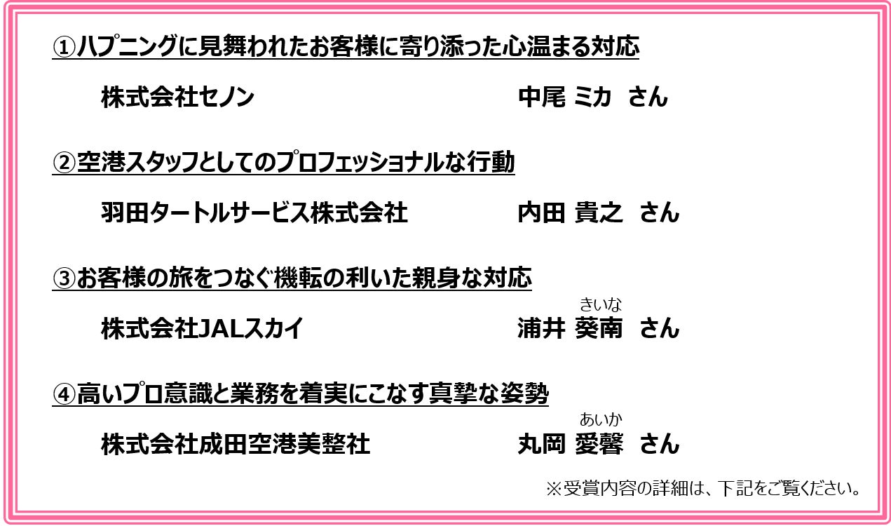 丸岡さんの対応を見たスタッフから「徹底したプロ意識を感じるとともに、空港スタッフが日々気持ちよく働けるのは、紛れもなく丸岡さんのような方のおかげだと感銘を受けた」とCS Awardに推薦が寄せられました。