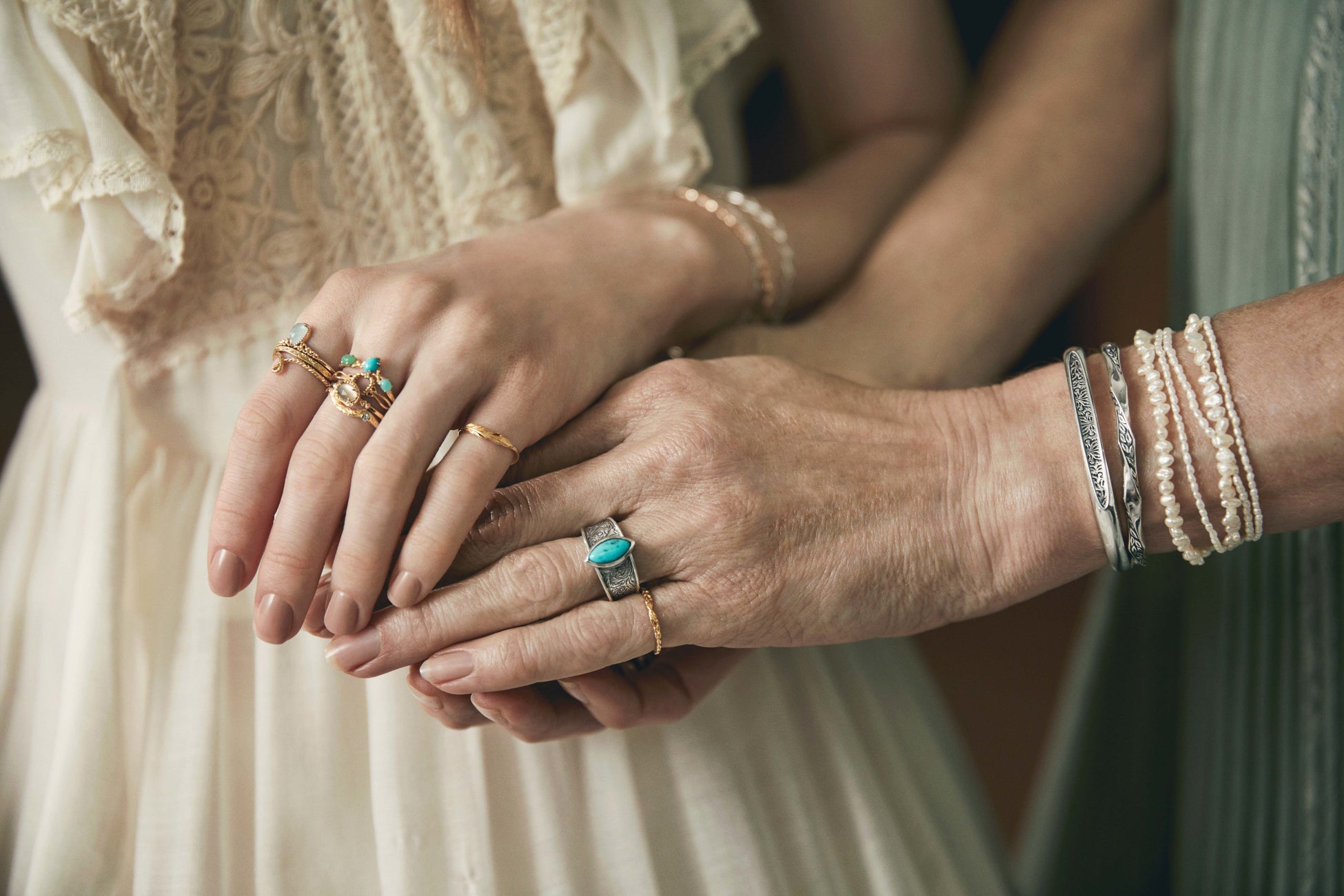 アンティークジュエリーによく使われていた手のモチーフや植物柄など、ユニセックスとしても使いやすいボリュームのあるSVバングルは、チェーンや細身のバングルと合わせるスタイリングがおすすめ。