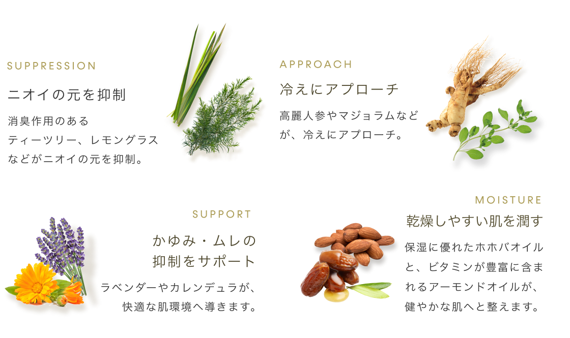 特にデリケートゾーンは敏感になり、冷え・ニオイ・かゆみなど悩みは尽きません。この3大悩みにアプローチする植物を結集させたクレンジングオイルならば、心地よく洗い上げながら、主にデリケートゾーンに起こりやすい悩みに向き合う事ができます。