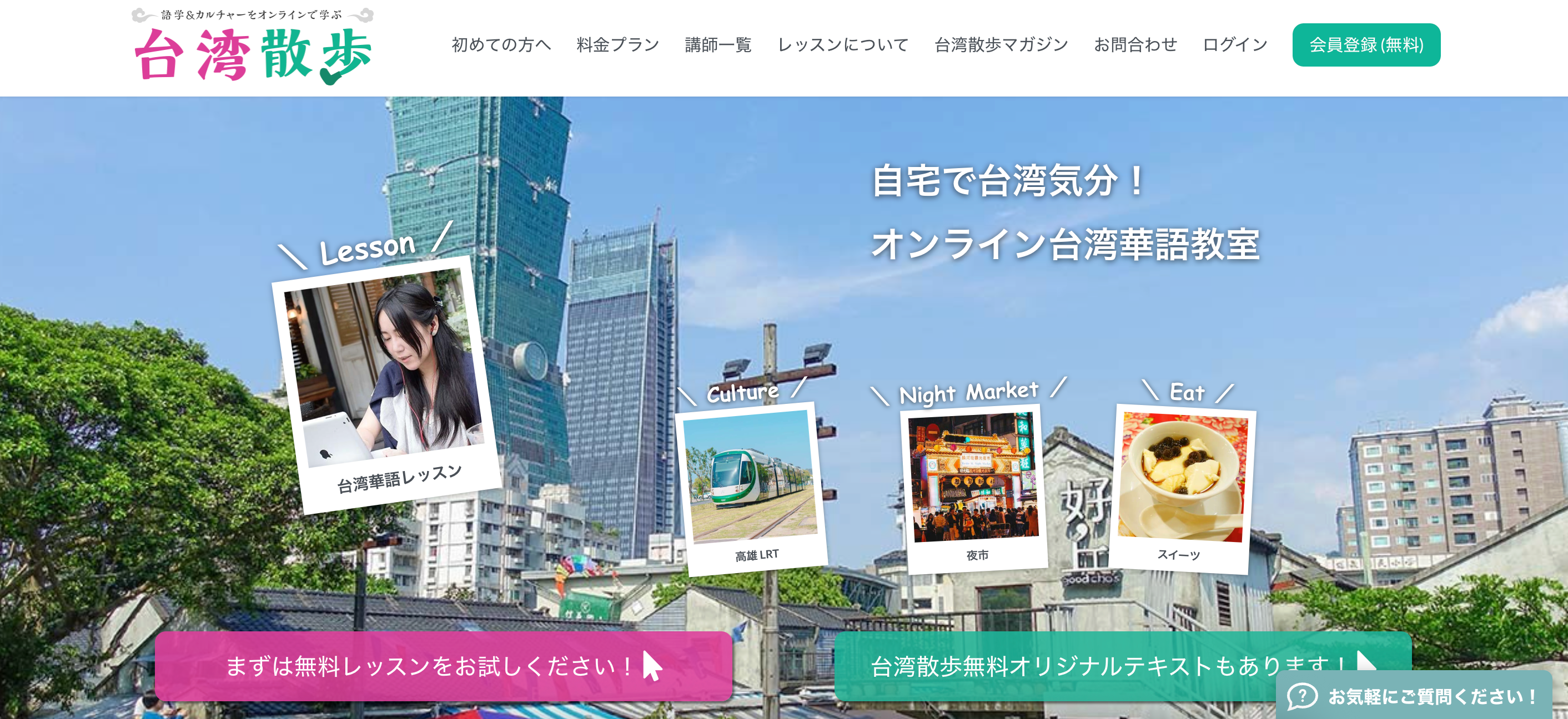「台湾散歩」は、パソコンでもスマートフォンでも簡単に自宅でレッスンが受講できる、オンラインの台湾華語(中国語)教室です。