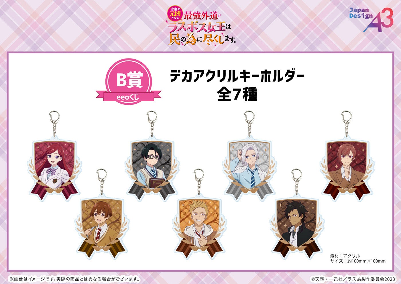 “制服”がテーマの描き下ろしイラストや、アニメの思い出が蘇る場面写を使用したグッズが景品となったTVアニメ『悲劇の元凶となる最強外道ラスボス女王は民の為に尽くします。』の「eeeくじ」。