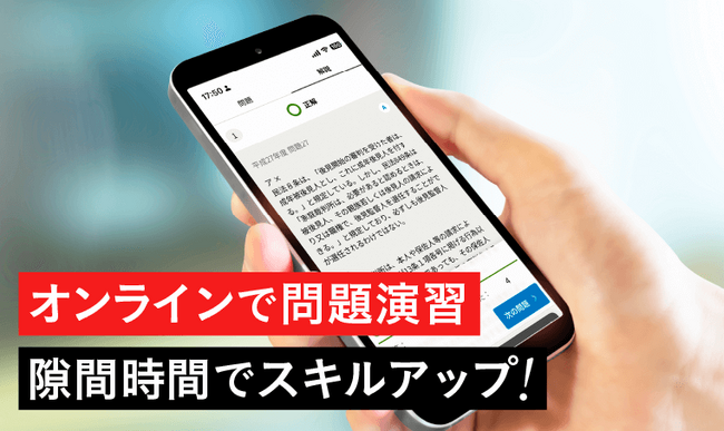 「オンライン演習サービスTOKERUKUN」では、お手持ちのスマートフォンで択一式試験の過去問を繰り返し解くことができます。 場所を選ばずに学習できるので、移動中などの隙間時間で択一式の解答力を磨くことができます。