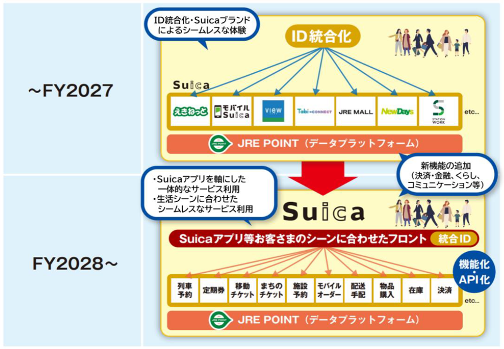 ・「Suicaの進化」とは、Suicaが「移動のデバイス」から飛躍的に利便性を高めた「生活のデバイス」になることです。今後のステップとしては、2027年度までにえきねっとやモバイルSuicaなどの各種ID統合でシームレスなご利用を可能とするとともに、クラウド化による新しい鉄道チケットシステム開始で、例えば、駅ビルで一定額のお買い物をされたお客さまに帰りの運賃割引のご提供を可能にします。さらに、Suicaアプリ(仮称)を2028年度にリリースすることでお客さまのご利用シーンにあわせたサービスを一括してご利用できるようにします。