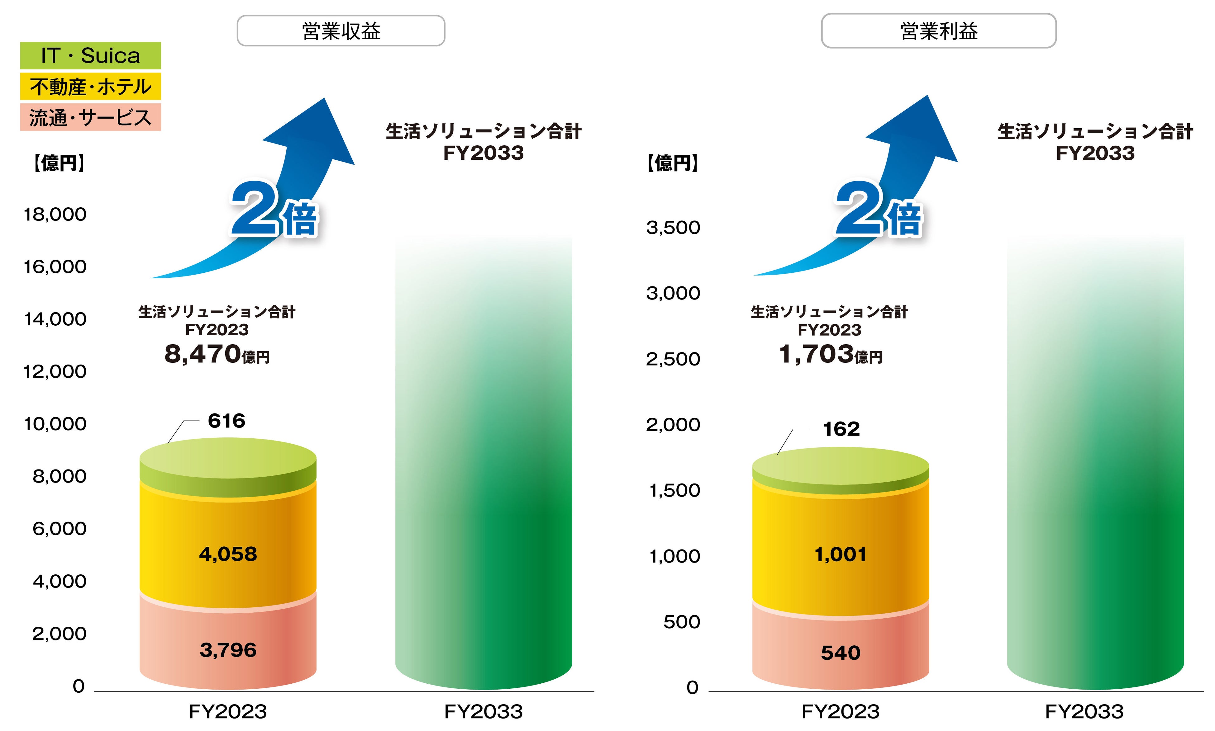 ・今後10年で現在のJRE POINT生活圏を飛躍的に拡大したリアル・デジタル双方にまたがる「Suica経済圏」を創出し、10年後(2033年度)における生活ソリューションの営業収益・営業利益を2023年度比2倍にすることを目指します。