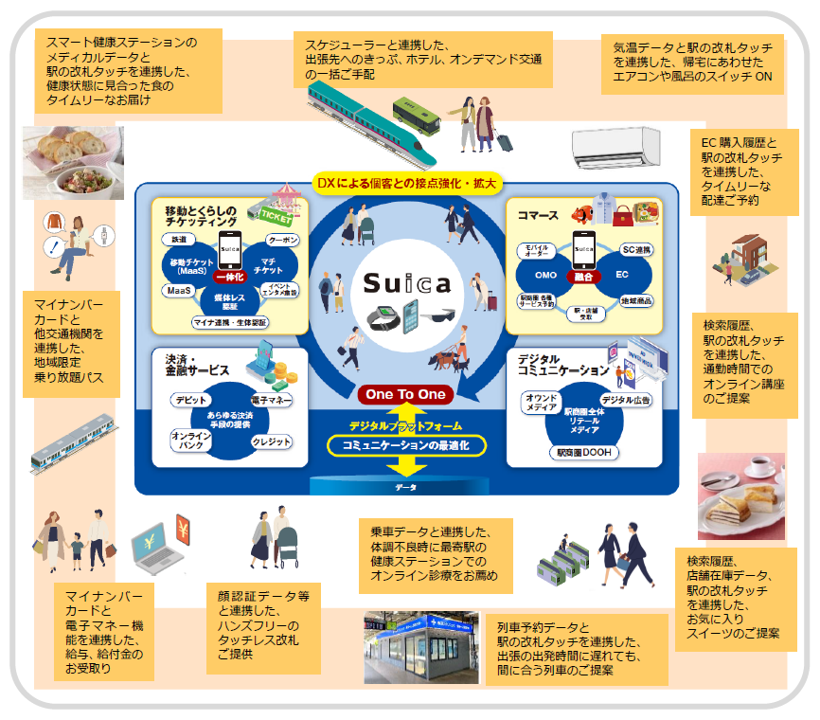 ・「Suicaの進化」とデータマーケティングによって構築するデジタルプラットフォームにより、リアル・デジタルのサービスをつなげ、お客さまに新たなライフ・バリューをご提供します。