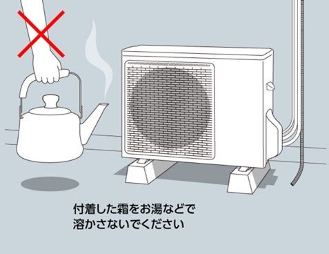 屋外の温度が低く湿度が高いときに、室外機に霜がつくことがあります。霜がつくと、エアコンの性能が低下して、暖房がきかなくなるため、霜を溶かす必要があります。