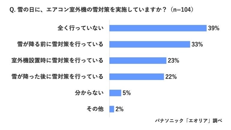 また、冬のエアコンで気になるのが雪対策。積雪地域にお住まいの方に、「雪の日に、エアコン室外機の雪対策を実施していますか?」とたずねたところ、「全く行っていない」(39%)と、約4割の方が雪対策を行っていないと回答。続いて、雪予報が出た際など「雪が降る前」(33%)、「室外機設置時」(23%)、「雪が降った後」(22%)と続く結果になりました。