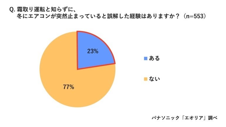 霜取り運転の内容を改めて理解した上で、これまでに霜取り運転と知らずに、冬にエアコンが突然止まっていると誤解した経験があるかたずねたところ、「ある」(23%)と約4人に1人が霜取り運転を知らずに誤解した経験があると回答しました。