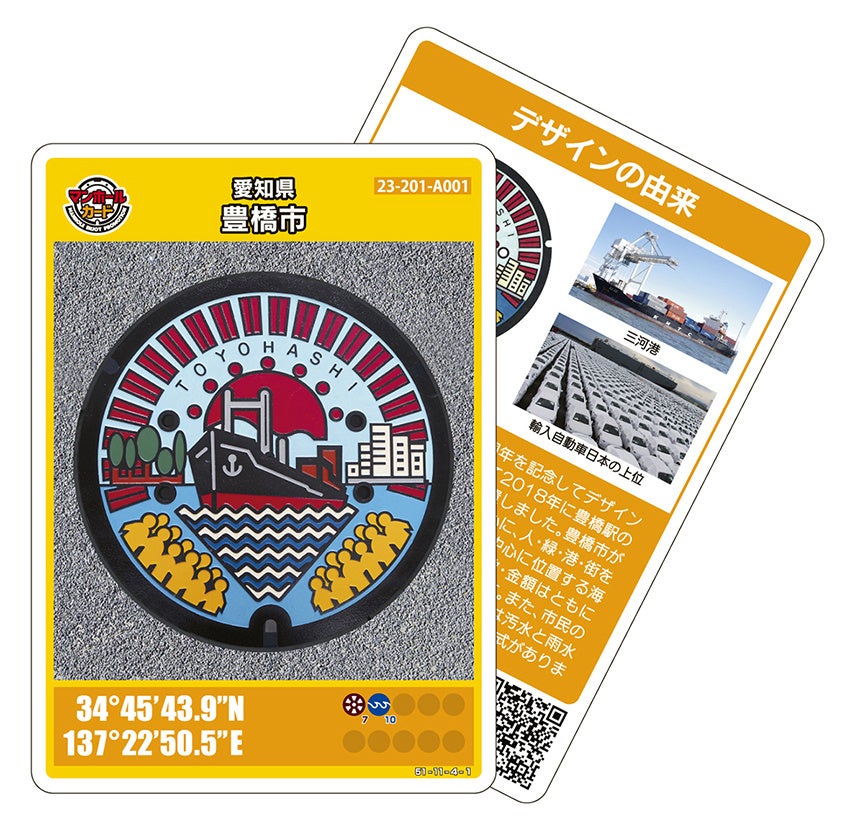 マンホールカードは、下水道への理解と関心を高めることを目的に、全国の自治体が独自のカラーマンホールをモチーフにして作製しています。各カードには、マンホール蓋の写真をはじめ、設置開始年やデザインの由来などが紹介されています。
