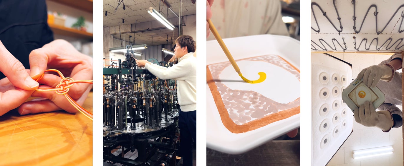 水引工芸(https://densan.kyoto/industry/engagement-decorations-and-mizuhiki/)、京くみひも(https://densan.kyoto/industry/kyo-kumihimo/)、京焼・清水焼(https://densan.kyoto/industry/kyo-yaki-and-kiyomizu-yaki/)の伝統産業職人が、TikTokクリエイターのデザイン監修のもと、オリジナルのイヤリング、スマホ用ショルダーストラップ、パン皿を制作。