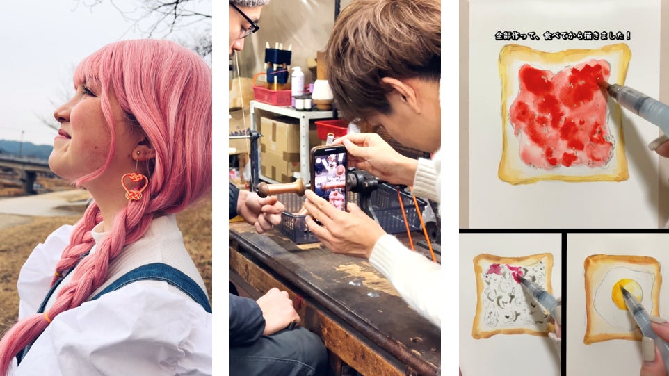 (以下画像左より、イヤリングを着用したTikTokクリエイター・おじゃす、職人の制作工程、TikTokクリエイター・momoによるデザインの様子)