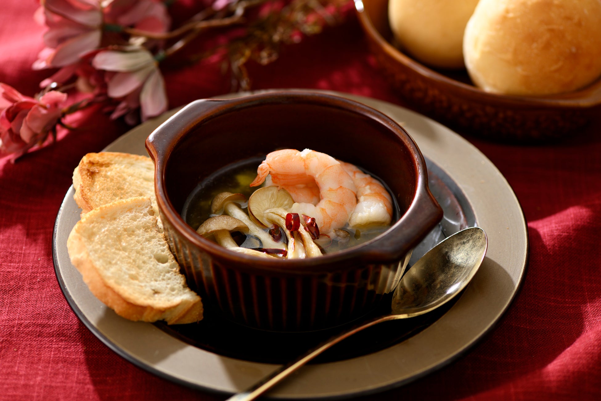 スペイン料理のアヒージョの風味を取り入れた、コク深いトマトベースのスープです。オリーブオイルとにんにくの香りが食欲をそそり、トマトの酸味と甘みが絶妙に調和しています。