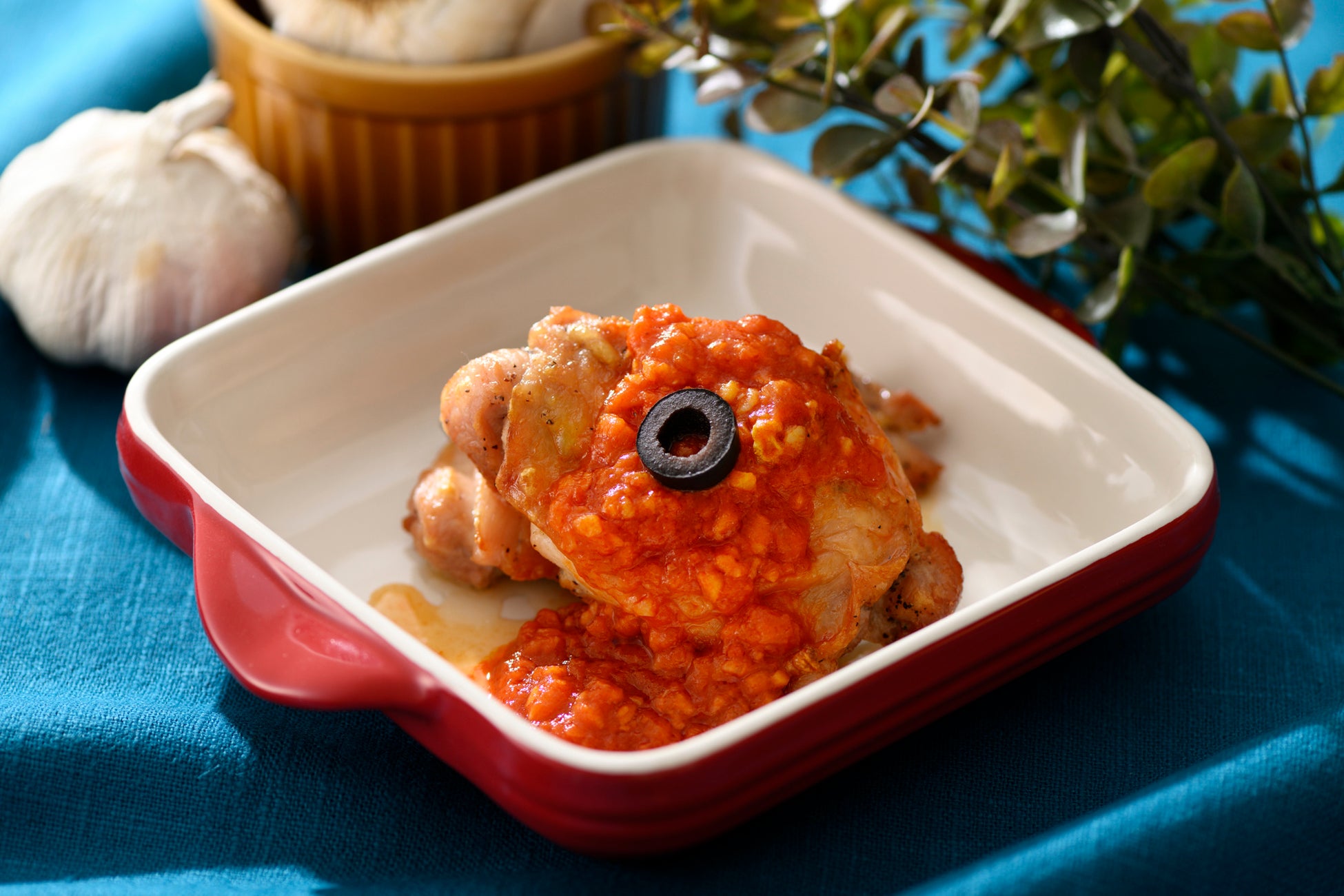 こんがりと焼き上げたジューシーな鶏もも肉に、香ばしいガーリックトマトソースをかけた一品。にんにくの香りが食欲をそそり、ソースが鶏肉の旨味を引き立て、濃厚な味わいに仕上がっています。