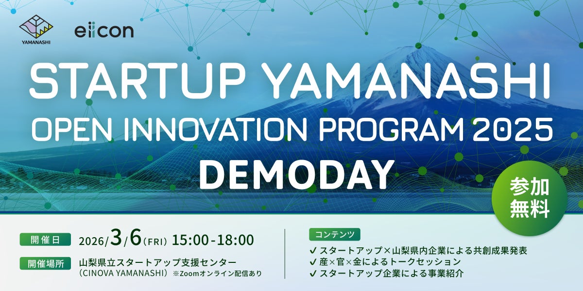 日本最大級のオープンイノベーションプラットフォーム「AUBA(アウバ)」を運営する株式会社eiicon(エイコン 本社所在地:文京区後楽、代表取締役社長:中村 亜由子、以下 eiicon)は、山梨県とともに、山梨県内企業が全国のスタートアップとの共創を目指すオープンイノベーションプログラムにて採択の4プロジェクトが成果を発表するイベント『STARTUP YAMANASHI OPEN INNOVATION PROGRAM 2025 DEMODAY(以下、本イベント)』を、2026年3月6日(金)CINOVA YAMANASHI(チノバヤマナシ:山梨県立スタートアップ支援センター)にて開催。本イベントの会場/オンライン参加者の募集を開始しました。