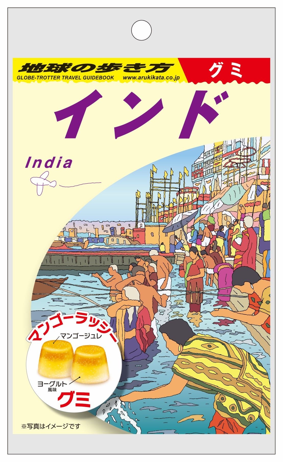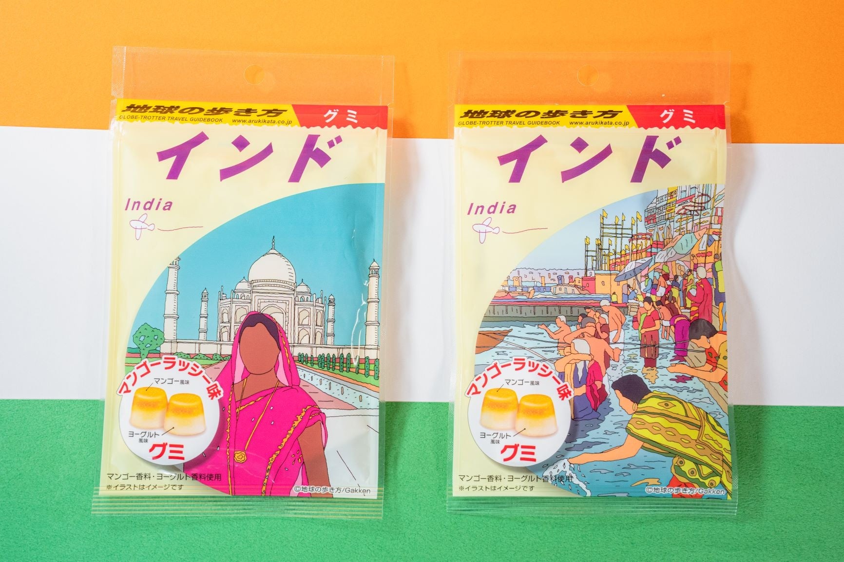 インド料理ではおなじみの、マンゴーラッシーの味をイメージしたグミです。パッケージは2種類で、どちらも旅行ガイドブック「地球の歩き方 インド」の表紙イラストを使用し、ガイドブックそっくりに仕上げました。インドへの渡航歴も豊富な地球の歩き方編集長にもご試食いただき、その美味しさに太鼓判をいただいております。