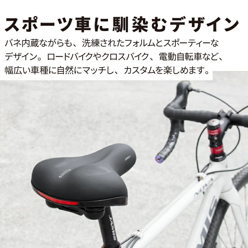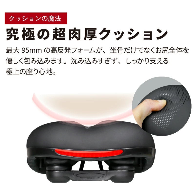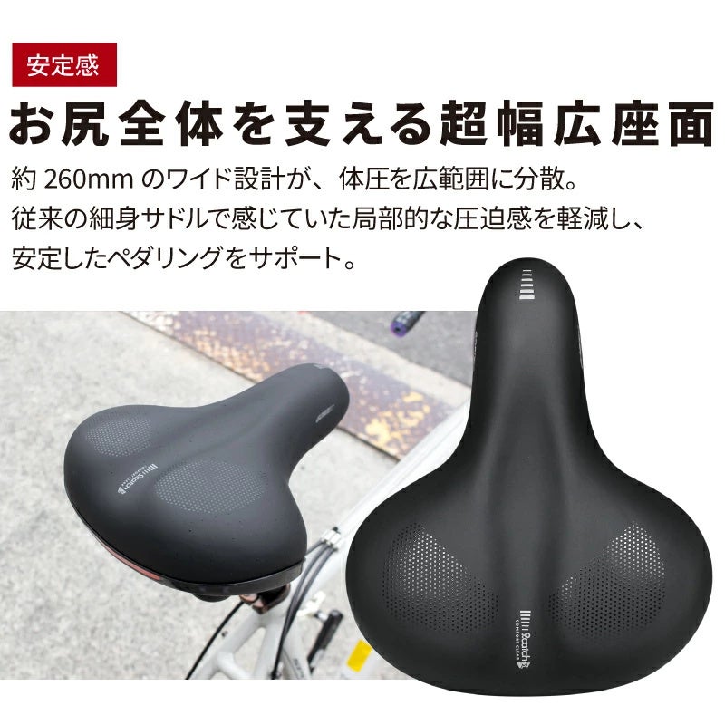 このサドルは、お尻の痛みや腰への負担を軽減するために設計された安定感と衝撃吸収に特化した