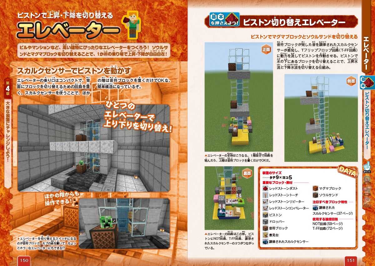 前半部で学んだレッドストーンに関する知識をフル活用して巨大装置の制作にもチャレンジ! 本書では、「TNTキャノン」や「自動花火打ち上げ機」「スライド式隠しドア」「自動収穫機&仕分け機」「巨大ピアノ」「エレベーター」など、大小織り交ぜ10種類の動く装置の作り方を紹介しています。
