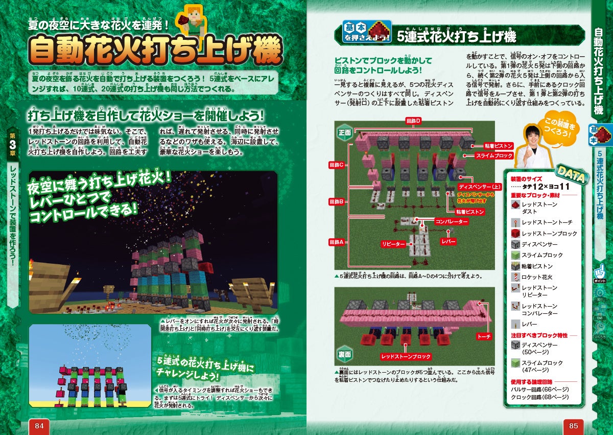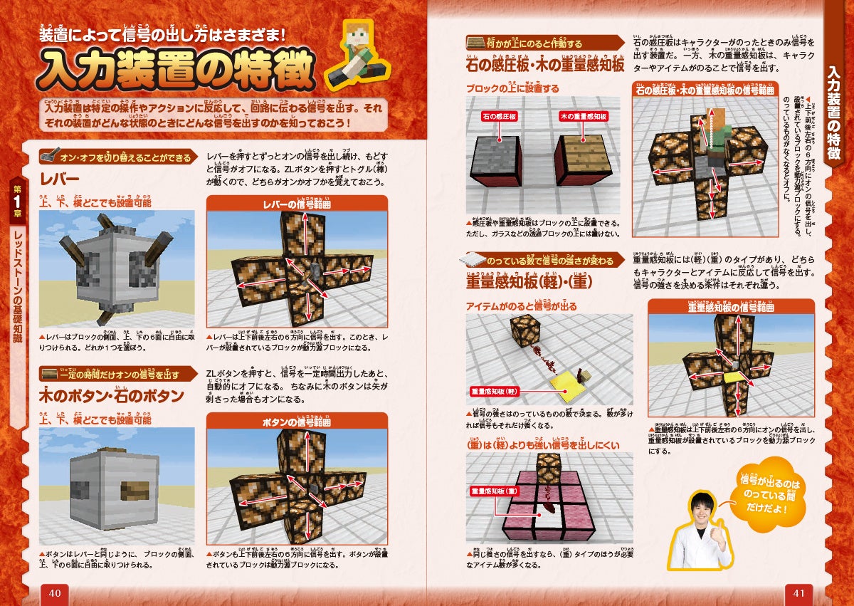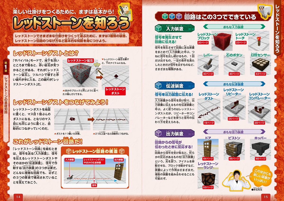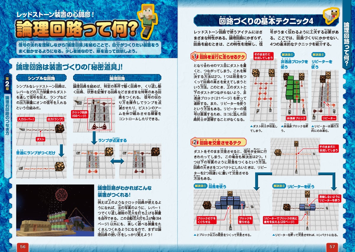 回路の構造を「入力装置」「伝達装置」「出力装置」の3つに分類して、どのようなアイテムやブロックがあるかを実例付きで紹介。さらに、回路づくりをするうえで知っておきたい基礎知識もしっかりと学べます。