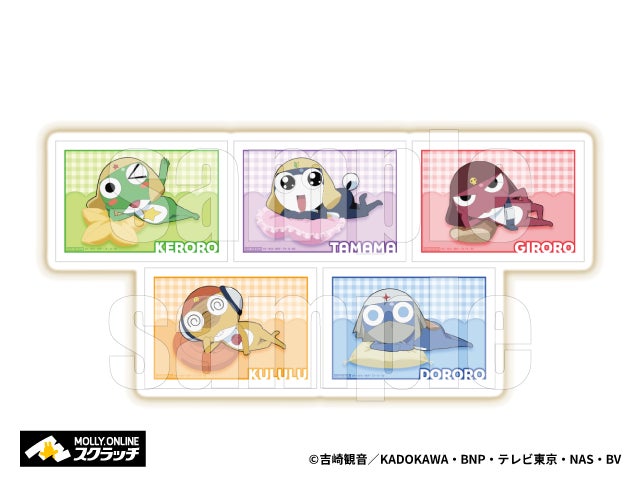 ケロロ、タママ、ギロロ、クルル、ドロロの新規描き下ろしイラストを使用したアクリルスタンド。