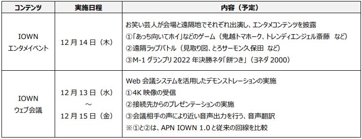 イベントでは、APN IOWN 1.0を活用した「IOWNエンタメイベント」と「IOWNウェブ会議」の2つのコンテンツを実施します。