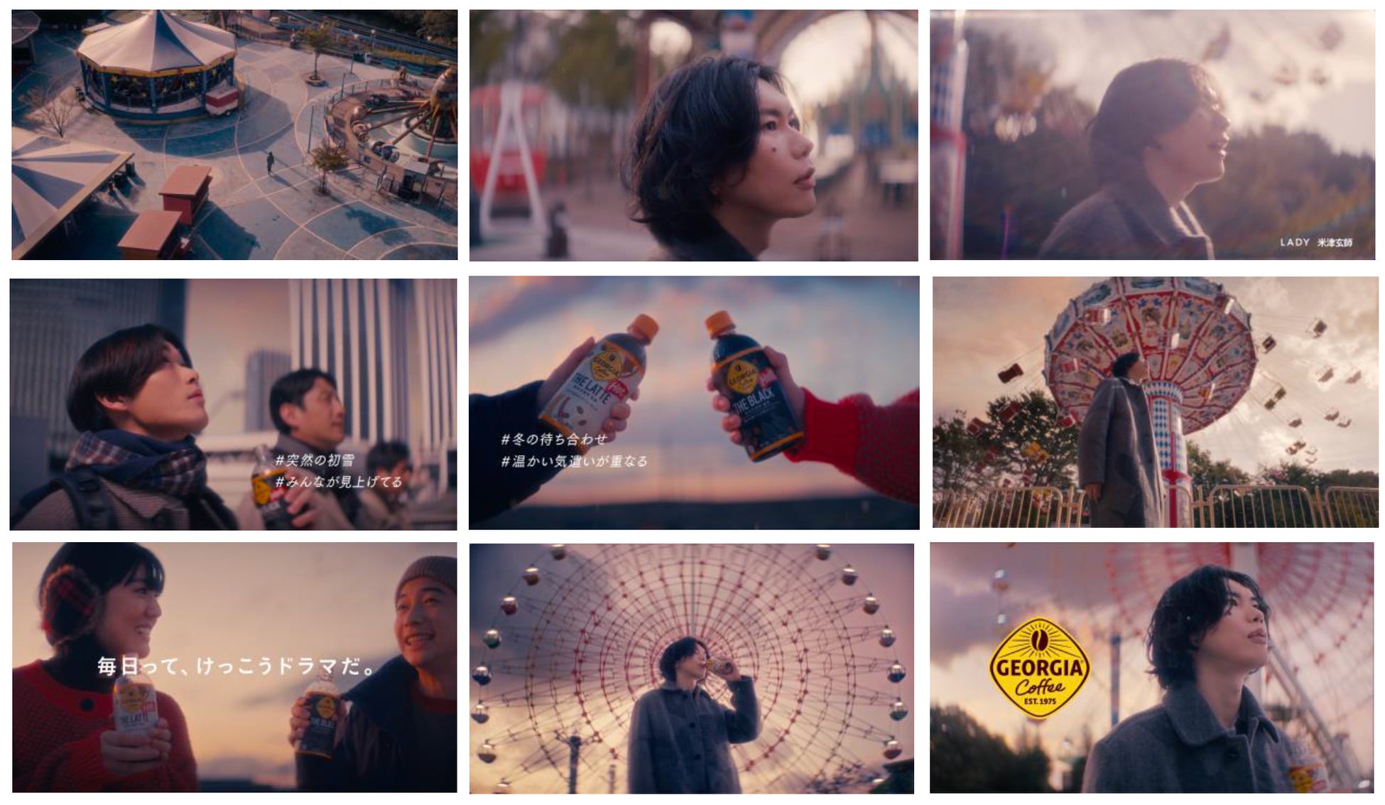 遊園地に、冬の装いで登場する米津玄師さん。冬空の下、乗り物の間を歩いていきます。「コーヒーを飲んで、ふと思った。普通の一日なんて、きっとない。」という米津さんのナレーションが流れると、書き下ろし楽曲「LADY」を歌う米津さんの姿をきっかけに、さまざまな登場人物の日常が流れていきます。突然の初雪に足を止める人々、冬の待ち合わせで、偶然にもお互い、相手のために暖かい「ジョージア」を用意していた瞬間など、それぞれの日常のシーンには、些細な出来事が“かけがえのない瞬間である”ということを表すハッシュタグが添えられています。最後は「なんでもない私の、なんでもない日々だけど、“毎日って、けっこうドラマだ。”」と、「ジョージア」のブランドキャンペーンメッセージでCMが締めくくられます。