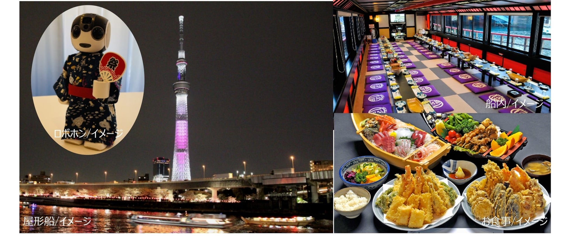 2022年7月9日(土)ご宿泊のお客様限定で、ロビーにてお客様をお出迎えしている“ロボホン”が船頭・観光ガイドをつとめる “屋形船貸し切りプラン”をご用意いたしました。敷居が高いと思われがちな屋形船ですが、当プランにご参加いただくことで、昔ながらの風情ある屋形船観光と、最先端技術であるロボットとのふれあいもお楽しみいただけます。約2.5時間の周遊では、東京スカイツリー®やお台場などの夜景をご覧いただきながら、お刺身の舟盛り、特選江戸前の天ぷらなど1万円相当の会席料理をお召し上がりいただき、アルコールとソフトドリンクは飲み放題にてご用意いたします。さらに、ご参加いただいたお客様の中から抽選で「変なホテル東京 浅草橋」の無料宿泊券、またお客様全員に「変なホテル東京 浅草橋」オリジナルの巾着と光るうちわをプレゼントいたします。屋形船は座席に余裕をもって運航し、お料理は小分けでご提供するなど、感染対策も実施しております。ホテルステイだけでなく、ホテル近隣施設と協力し、浅草橋の街をお楽しみいただける宿泊プランの販売をすることで、ホテルを基点とした浅草橋エリアの観光の発展の一翼を担いたいと考えております。