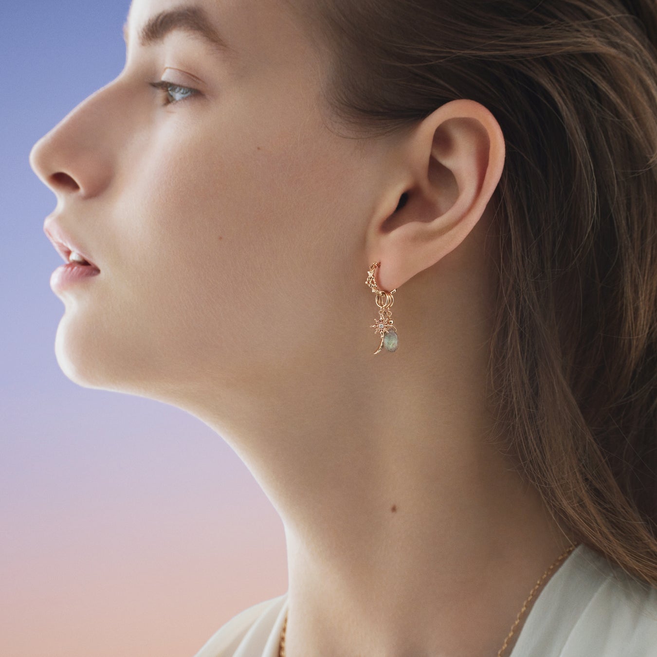 連なる小さな星々と、その周囲に線のような輝きとして現れる光条をモチーフにしたピアスは、前面は透かし模様でボリュームを持たせ、背面はチャームを通しやすいよう細身に仕上げています。