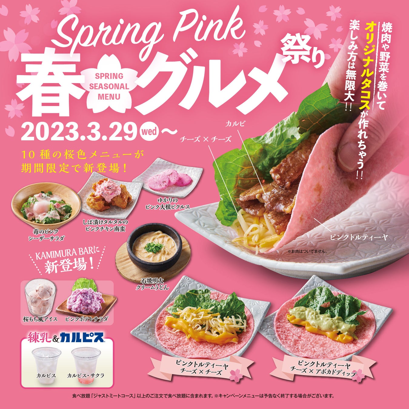 この度の「春グルメ祭り」で新登場するメニューは、焼肉や野菜を巻いてオリジナルタコスが作れる「ピンクトルティーヤ チーズ×アボカドディップ」と「ピンクトルティーヤ チーズ×チーズ」をはじめ、「ゆかりのピンク大根ピクルス」「石焼明太クリームうどん」「しば漬けタルタルのピンクチキン南蛮」「苺のピンクシーザーサラダ」、またサラダやナムル、デザートやアイスクリームをビュッフェ形式でお楽しみいただくことができる「KAMIMURA BAR」への追加ラインナップとして「ピンクポテトサラダ」と「桜もち風アイス」といった計8種の桜色メニューと、さらに「ビストロかみむら」メニューで大人気の「練乳&カルピス」から「カルピス」と「カルピス&サクラ」の2種が登場します。これら「春グルメ祭り」メニューは「ジャストミートコース」以上の食べ放題コースでもご注文いただくことができるため、食べ放題コースをご注文いただいたお客様は食べ飲み放題としてお楽しみいただくことができます。
