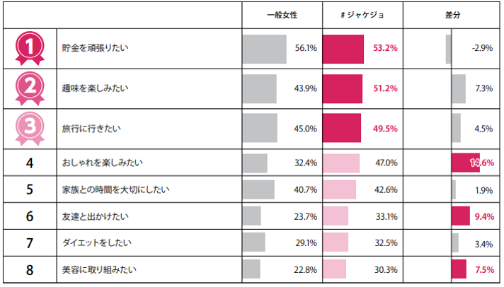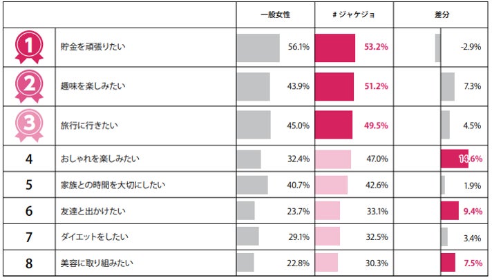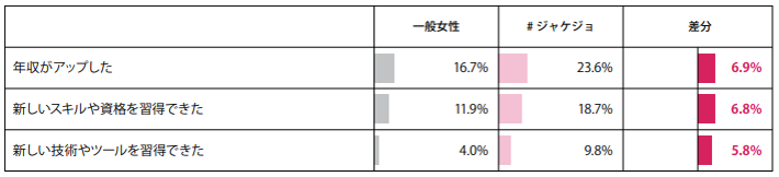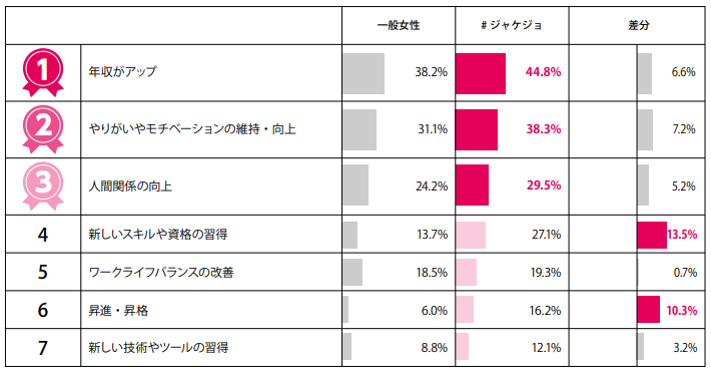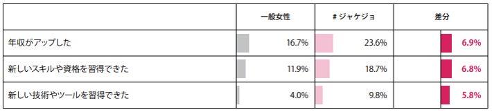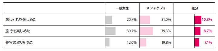 #ジャケジョの約6割が仕事面で「満足している」(一般女性+18.6ポイント)と回答しており、その理由として、「収入アップ」「新しいスキル・資格の習得」「新しい技術・ツールの習得」と日頃の努力が実った結果となりました。プライベートでも、#ジャケジョの約7割が「満足している」(一般女性+13.5ポイント)と回答しており、「おしゃれを楽しめた」「旅行を楽しめた」「美容に取り組めた」と、プライベートでも充実した1年を過ごした#ジャケジョが多かったようです。