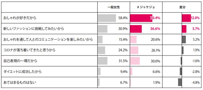 2024年の仕事面での抱負TOP3は「年収アップ」「やりがいやモチベーションの維持・向上」「人間関係の向上」(グラフ5)でした。「新しいスキル・資格の習得」「昇進・昇格」に対する意欲も高いことから、来年も積極的に仕事に取り組みたい#ジャケジョが多いことがわかります。プライベートにおいては、「貯金」「趣味の充実」「旅行」がTOP3という結果に(グラフ6)。特に、「おしゃれを楽しみたい」割合が一般女性より高く、その理由として「おしゃれが好き」「新しいファッションに挑戦したい」を挙げており、#ジャケジョのファッション意欲の高さや好奇心の高さがうかがえます(グラフ7)。