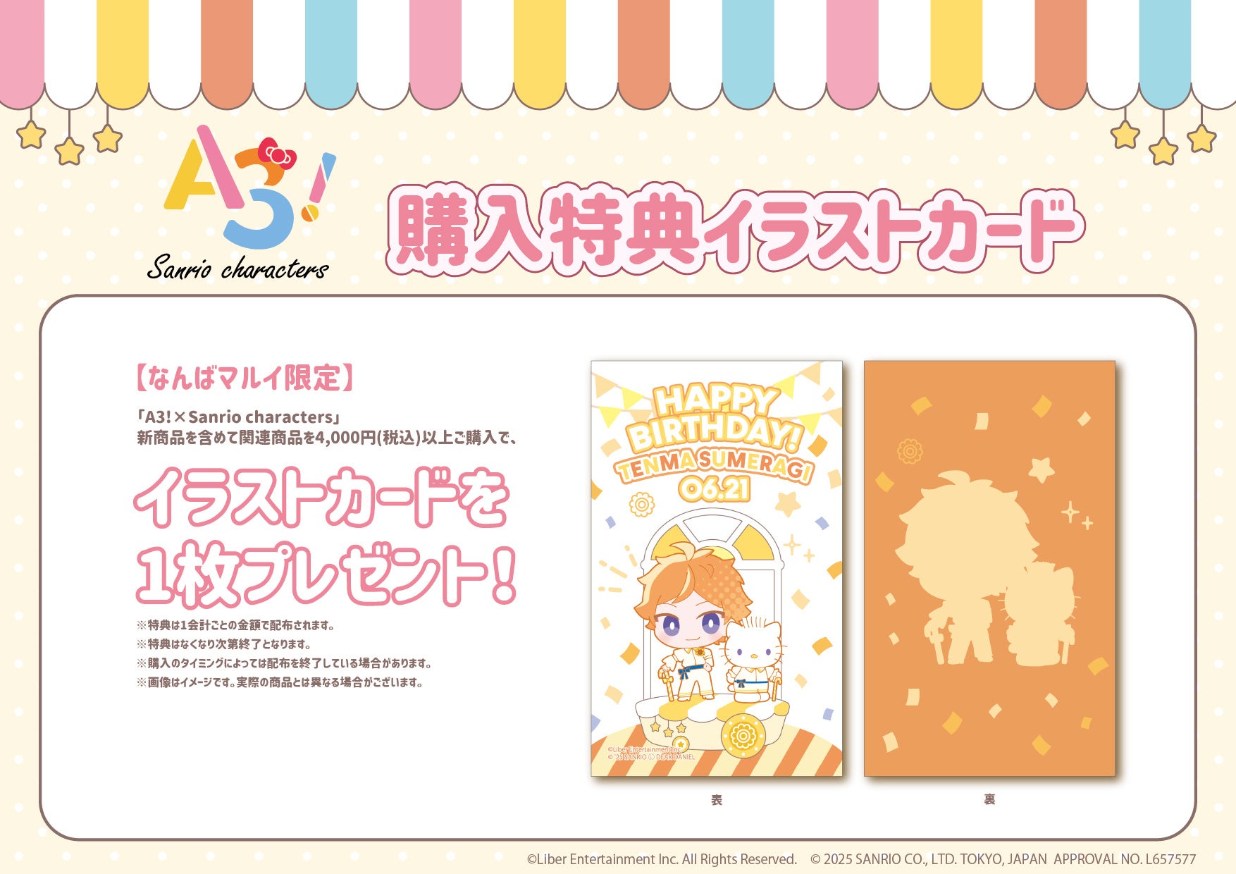 「A3!×Sanrio characters」新商品を含めて関連商品を1会計4,000円(税込)以上お買い上げで、購入特典としてイラストカード(全1種)を1枚プレゼント。