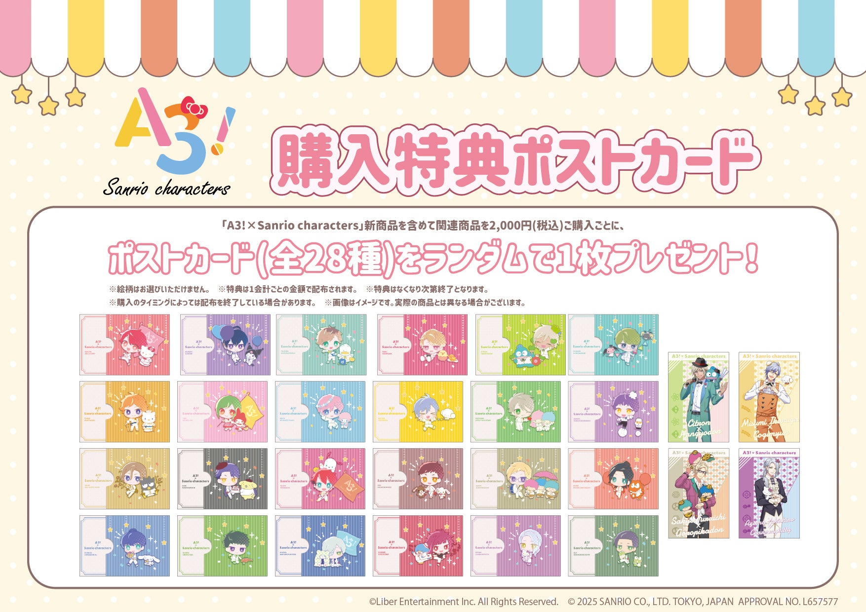 「A3!×Sanrio characters」新商品を含めて関連商品を1会計2,000円(税込)お買い上げごとに、購入特典としてポストカード(全28種)をランダムで1枚プレゼント。