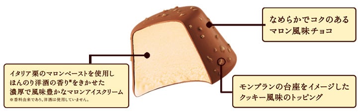 イタリア栗のマロンペーストを使用したマロンアイスクリームには、ほんのり洋酒の香り※をきかせており、濃厚で風味豊かなマロンの味わいを感じられる、大人の味わいに仕上がっています。