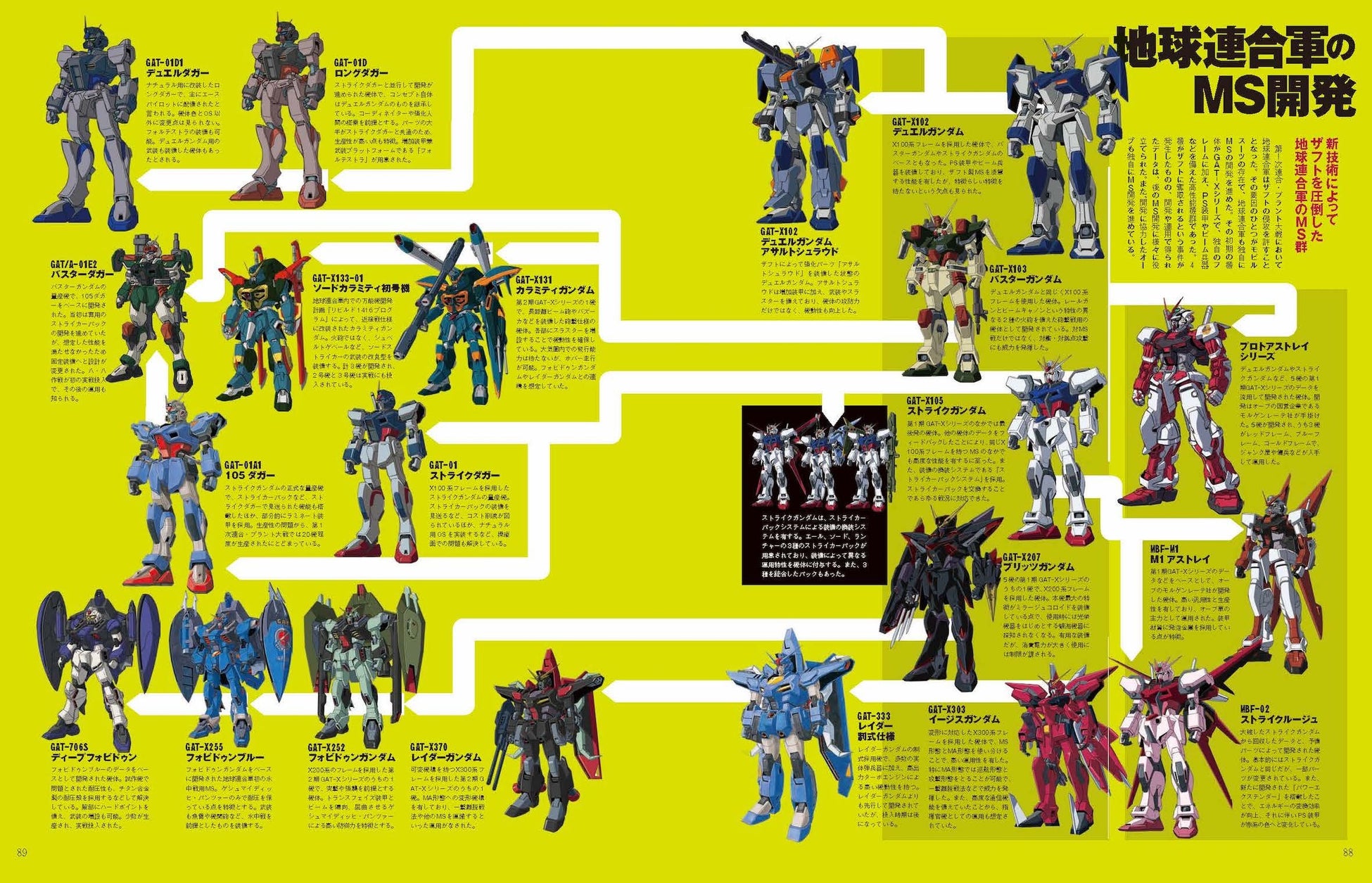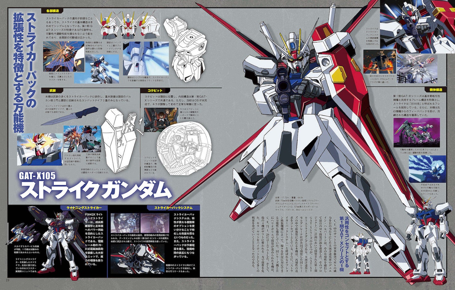 巻頭のカラーグラビアからスタートし「第1次連合・プラント大戦の戦況図解」「コズミック・イラの歴史をタイムラインで読み解く」「地球連合軍、ザフト、オーブのモビルスーツを徹底解説」など。