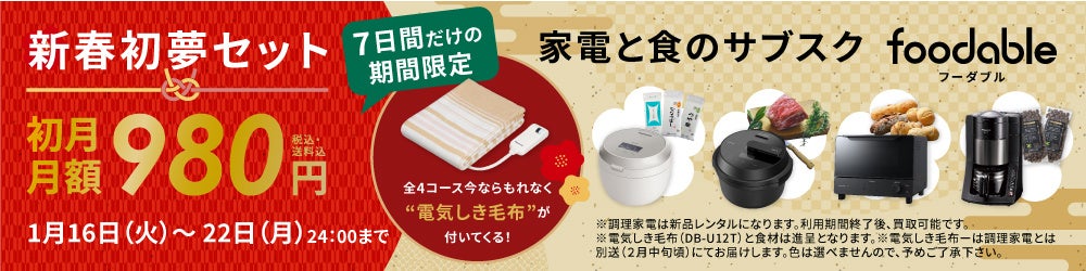 パナソニック株式会社(以下、パナソニック)は、家電と食のサブスクサービス「foodable(フーダブル)」にて、ポカポカ新春初夢セットを用意いたしました。調理家電、厳選食材に加え、電気しき毛布(シングルSサイズ DB-U12T)がついた特別セットは、初月月額980円(送料込み・税込み)で販売します。