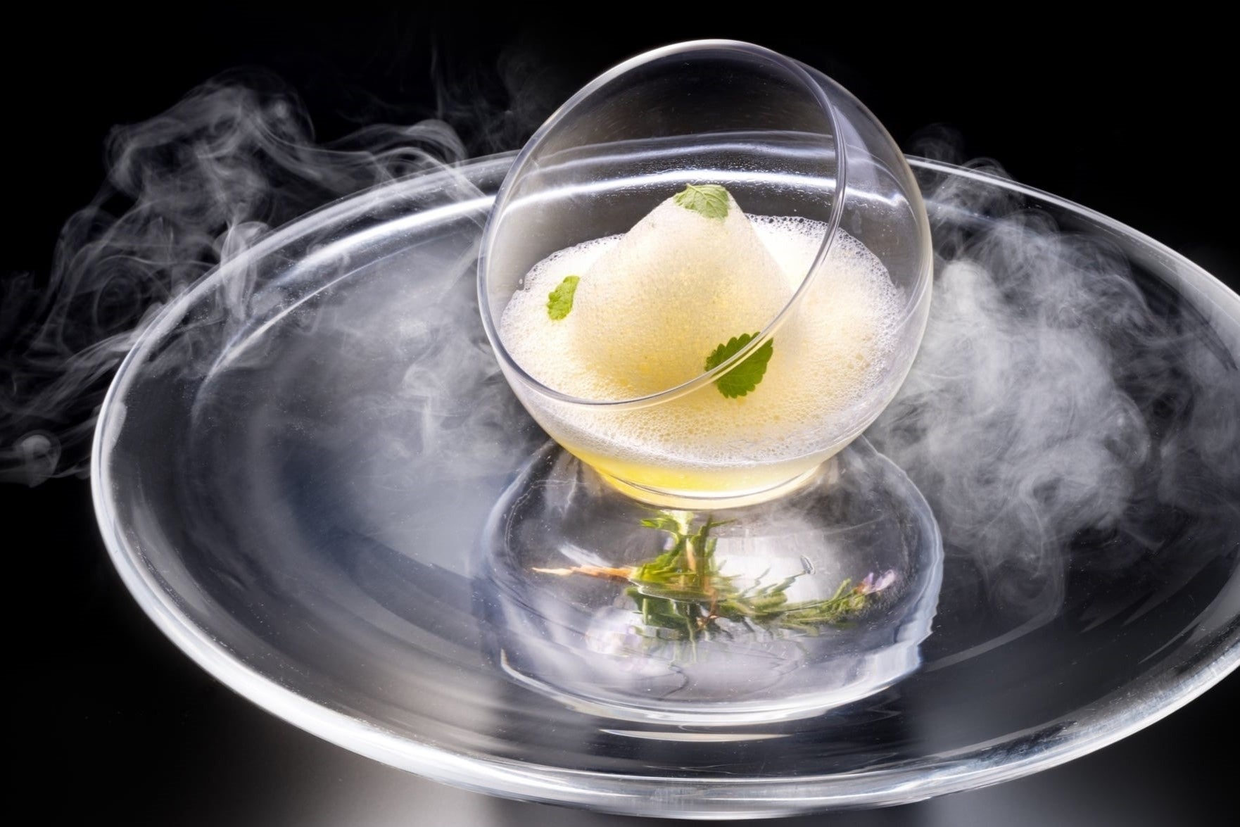 お口直しのグラニテは弾けるキャンディのアクセントをあしらい、グランデセールにはショコラを使った目にも美しいひと皿をお届けします。