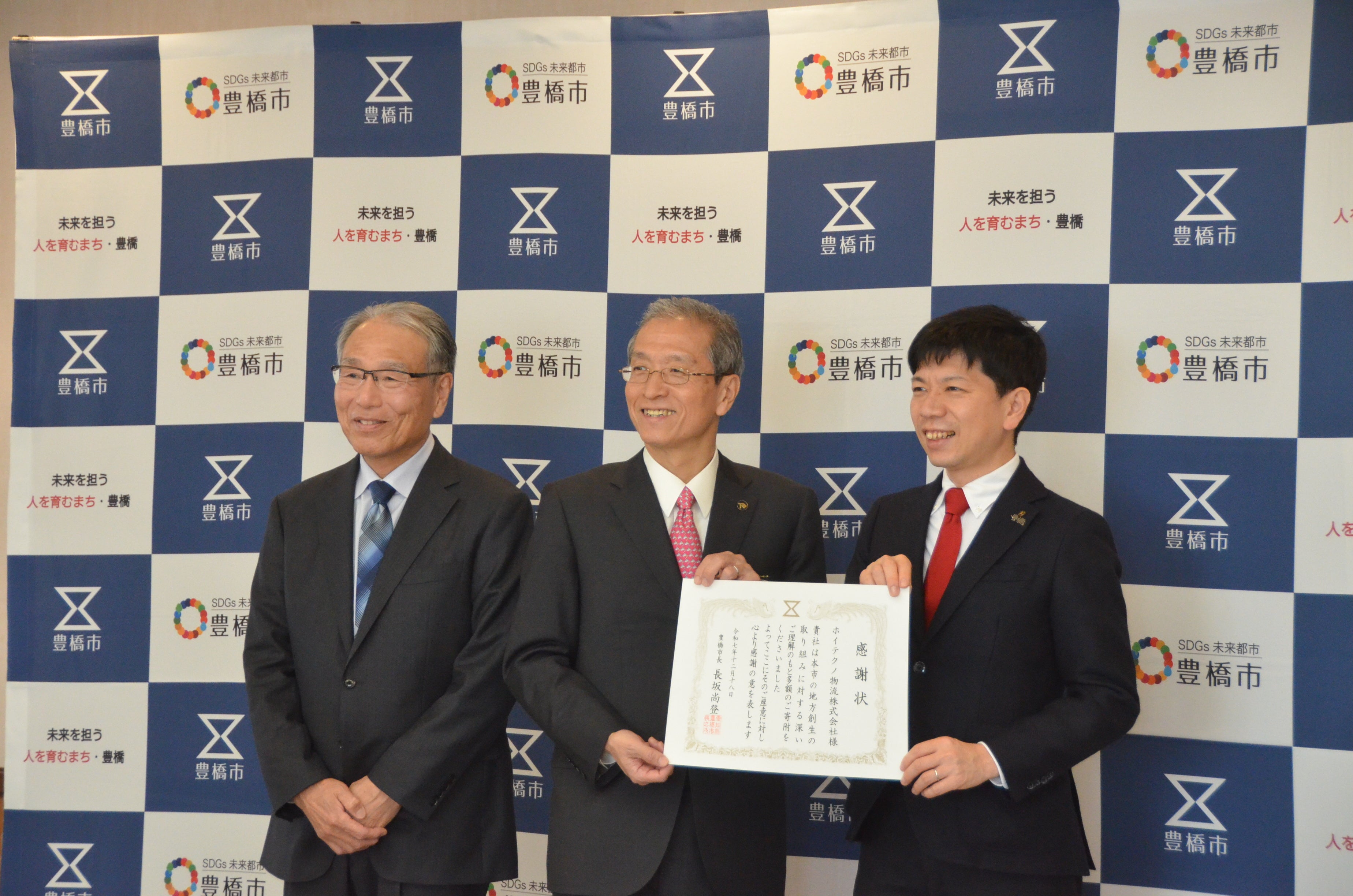 愛知県豊橋市は、「多目的屋内施設及び豊橋公園東側エリア整備・運営事業」について、企業版ふるさと納税の制度を活用し、企業の皆さんから寄附金を受け付けています。2025年8月1日(金)から始めたところ、県内外の企業の皆さんから申し出があり、12月18日(木)には、300万円を寄附した物流会社、ホイテクノ物流株式会社(愛知県蒲郡市)に感謝状を贈りました。