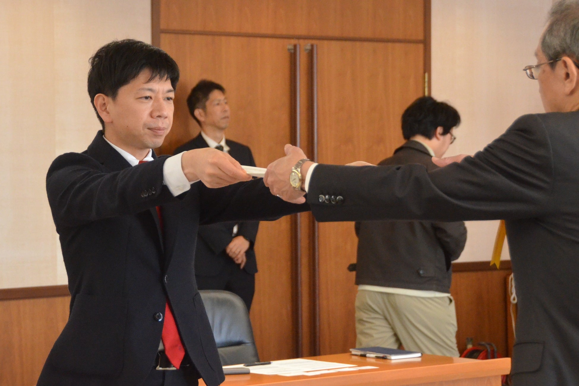 市役所で開かれた感謝状の贈呈式では、寄附目録の贈呈に続き、長坂尚登市長が青木良浩代表取締役会長に感謝状を手渡しました。