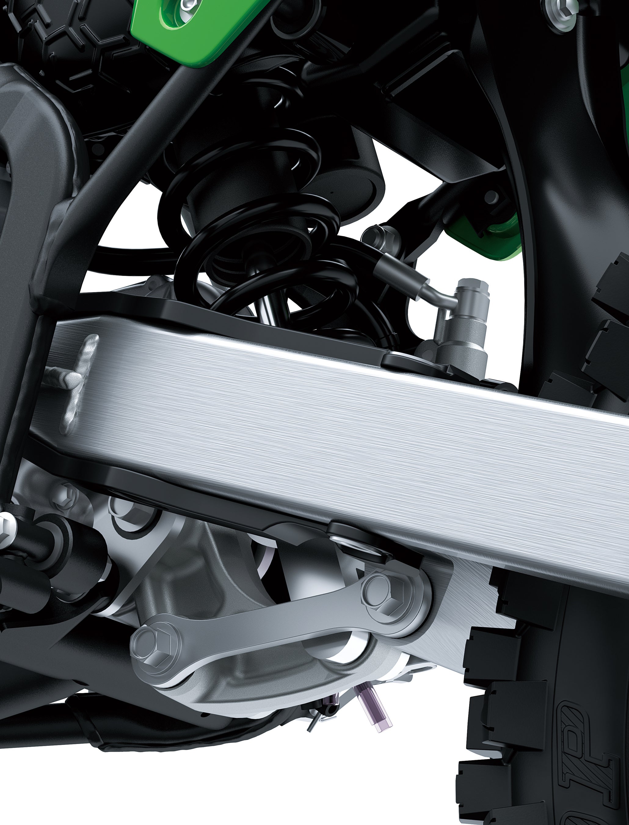 2026年モデルでは、カワサキのフルサイズモトクロッサーから着想を得たシャーシコンポーネントを継承しつつ、全てのモデルに従来モデルより大径化したインナーチューブ径ø43mm 倒立フロントフォークを採用。調整機構をフルアジャスタブルとし、アウターチューブには耐摩耗性を向上させるカシマコートを施工しています。また、KX112/KX85 Lのリヤサスペンションストローク量は、フルサイズモトクロッサーと同等の305mm に増加しています。※KX85は変更なし