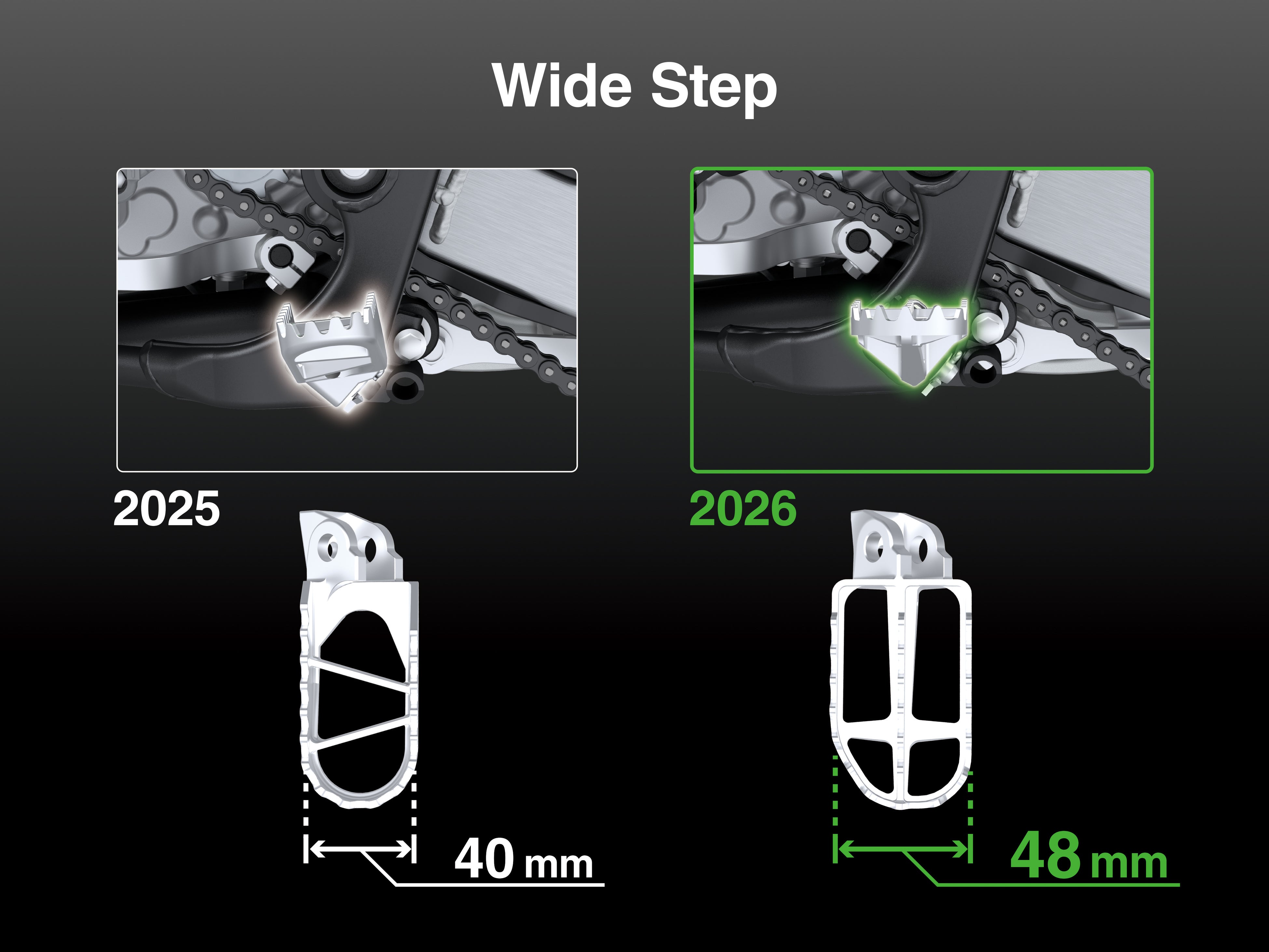 ・ステップ幅40mm → 48mm と幅広くなり、KX450に似た形状のステップ
