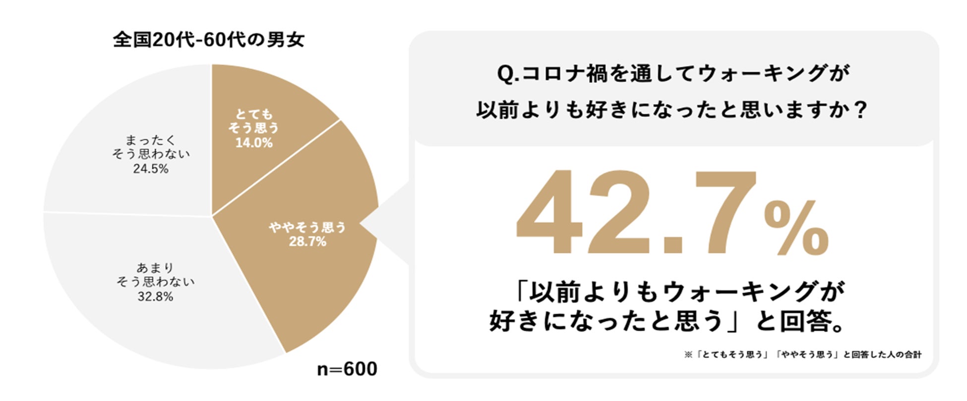 ① コロナ禍を経て、以前よりもウォーキングが好きになったと42.7%が回答
