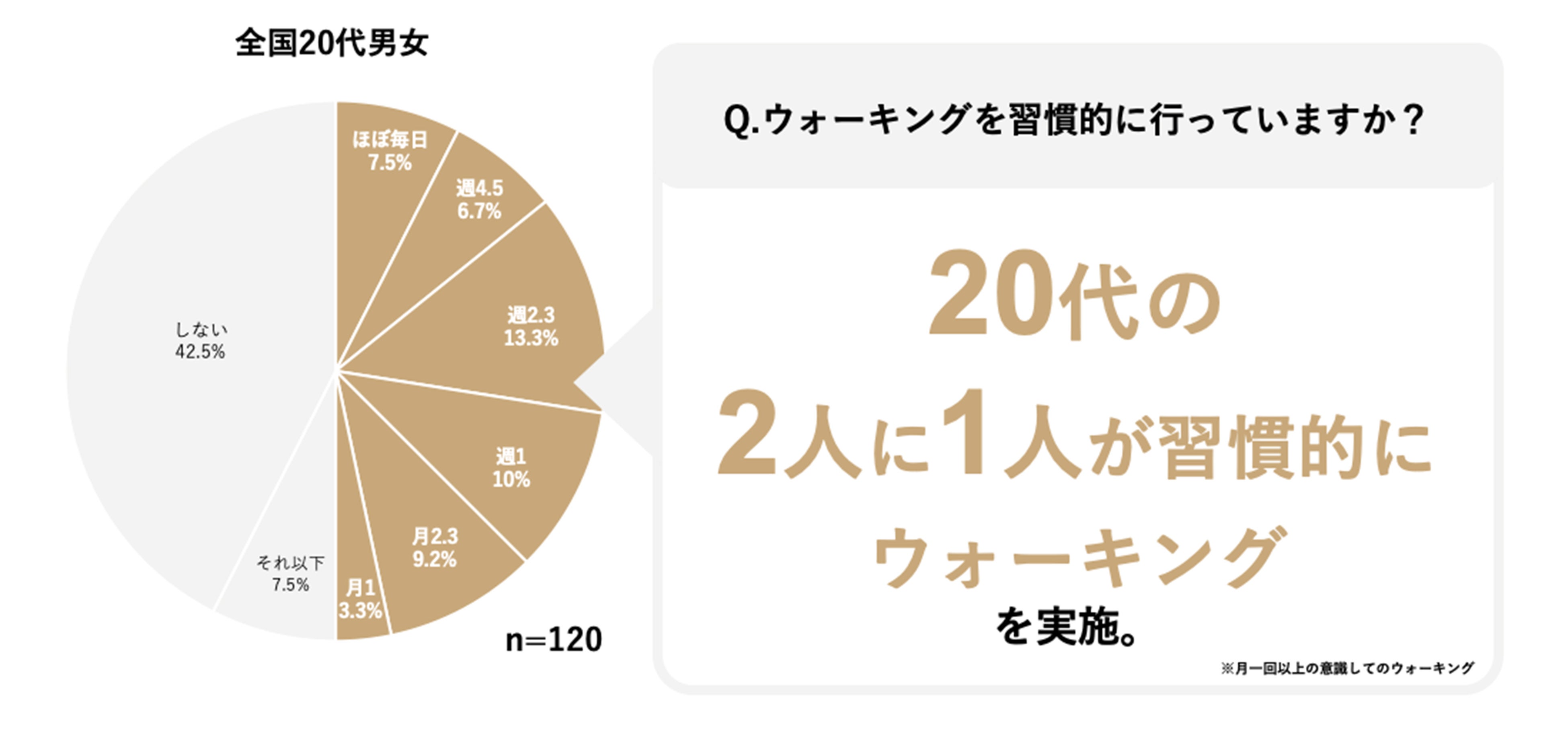 また、ウォーキングに対する習慣を20代に尋ねたところ「月に一回以上習慣的にウォーキングを行っている」と回答。若い世代はウォーキングをする人のイメージとして年配向けと思う人は少ないこと、20代もウォーキングを日常に取り入れ、中高齢だけでなく、若年までが幅広く、カジュアルにウォーキングを楽しむ、という現状が明らかになりました。