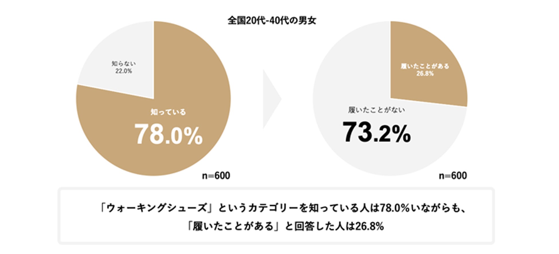 調査対象の全年代で、多くの人がウォーキングをしているという選択肢を選ぶ中で、「ウォーキングシューズ」というカテゴリーを知っている人は78.0%いながらも、「履いたことがある」と回答した人は3割以下にとどまり、今後もより成長の余地があるシューズ領域であることがわかります。加えて重視する内容では履き心地(61.7%)や軽さ(38.3%)に加えてファッション性(18.3%)も重要視していることがわかりました。