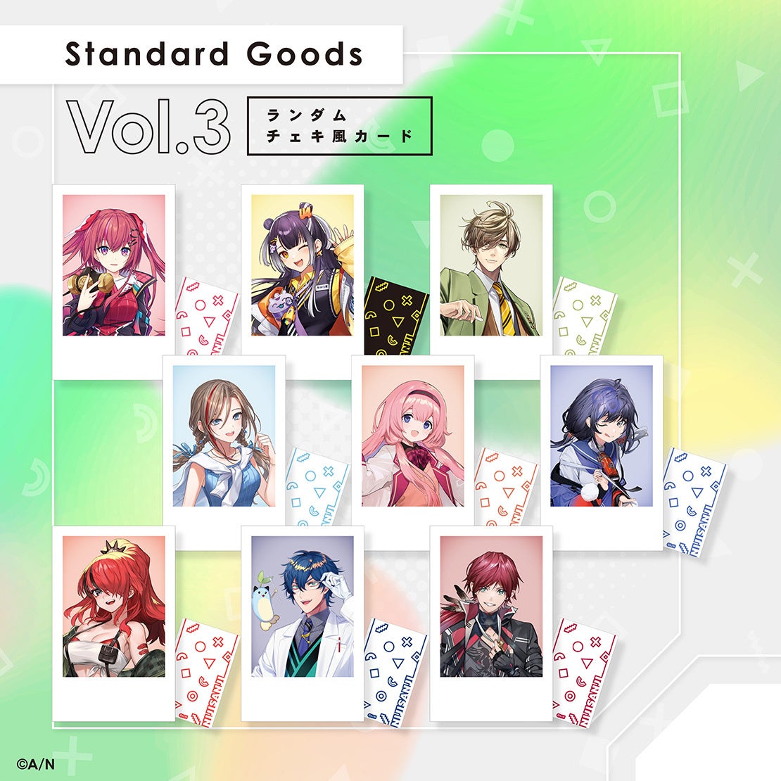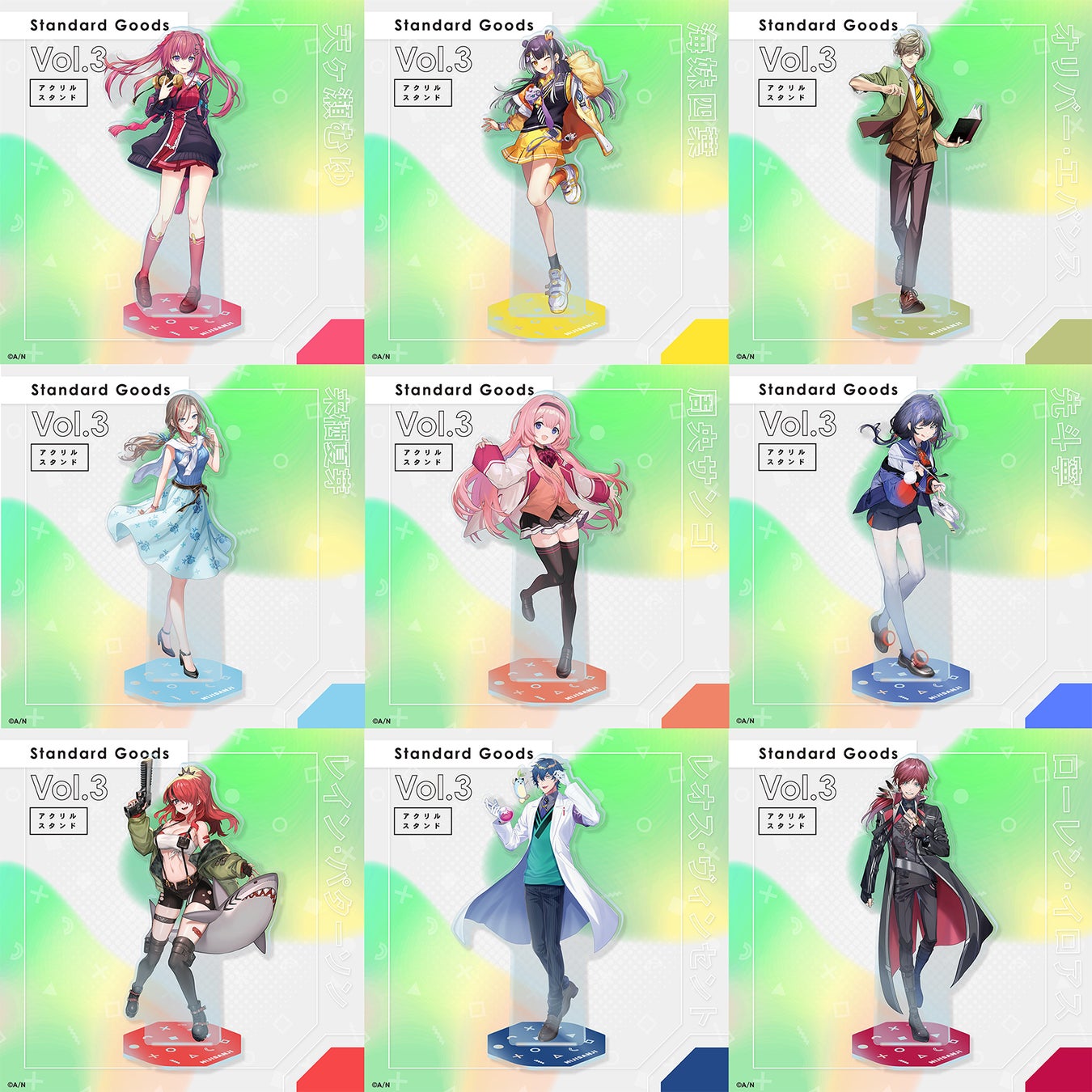 新ビジュアルを使用した新グッズシリーズ「Standard Goods」より、Vol.3としてにじさんじライバーの天ヶ瀬むゆ、海妹四葉、オリバー・エバンス、来栖夏芽、周央サンゴ、先斗寧、レイン・パターソン、レオス・ヴィンセント、ローレン・イロアス 9名の「アクリルスタンド」と「ランダムチェキ風カード」の販売が決定いたしました。