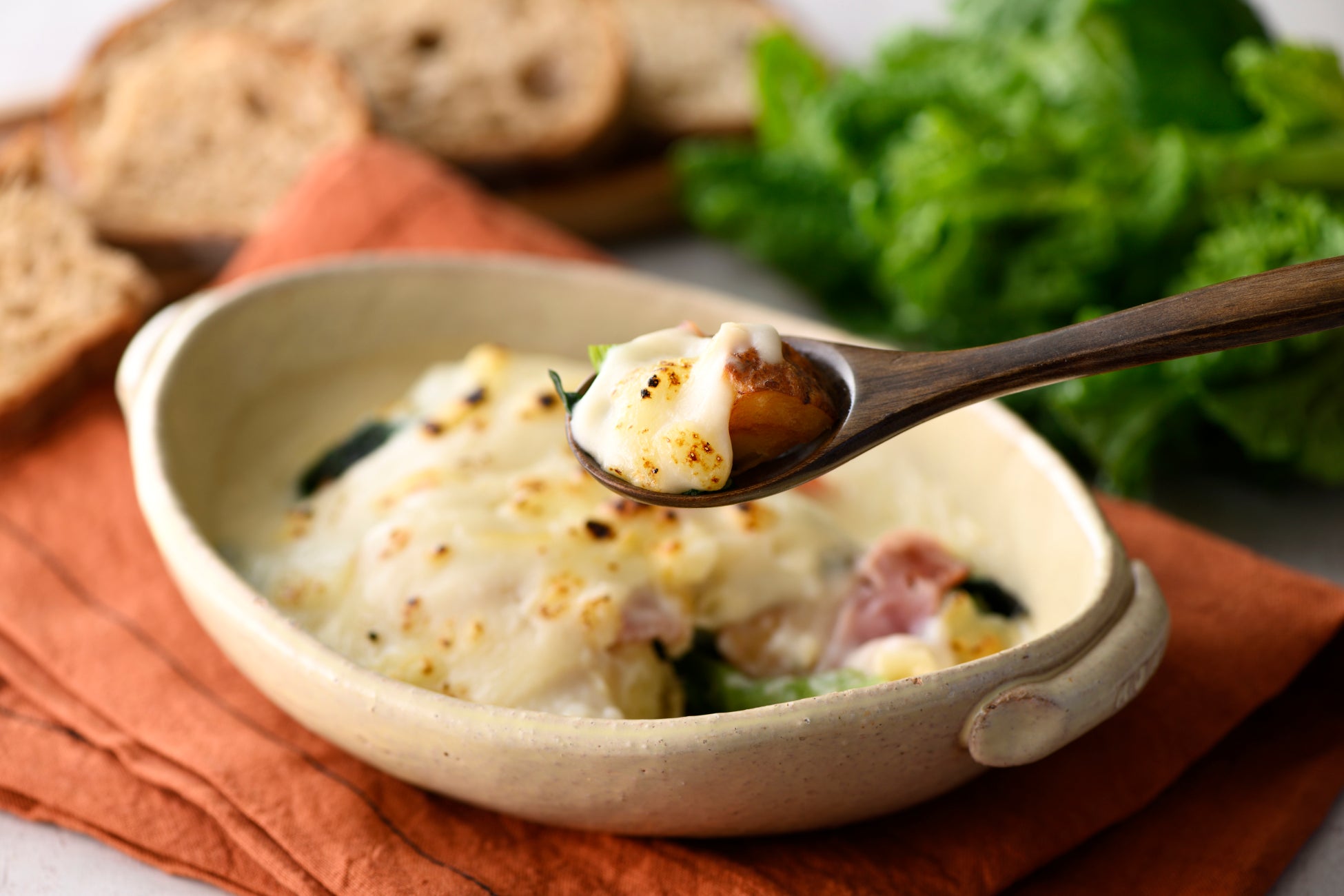 菜の花のほろ苦さとベーコンの旨み、ホクホクのポテトを濃厚なソースで包み込んだグラタン。春らしい味わいと香ばしい焼き上がりが食欲をそそります。