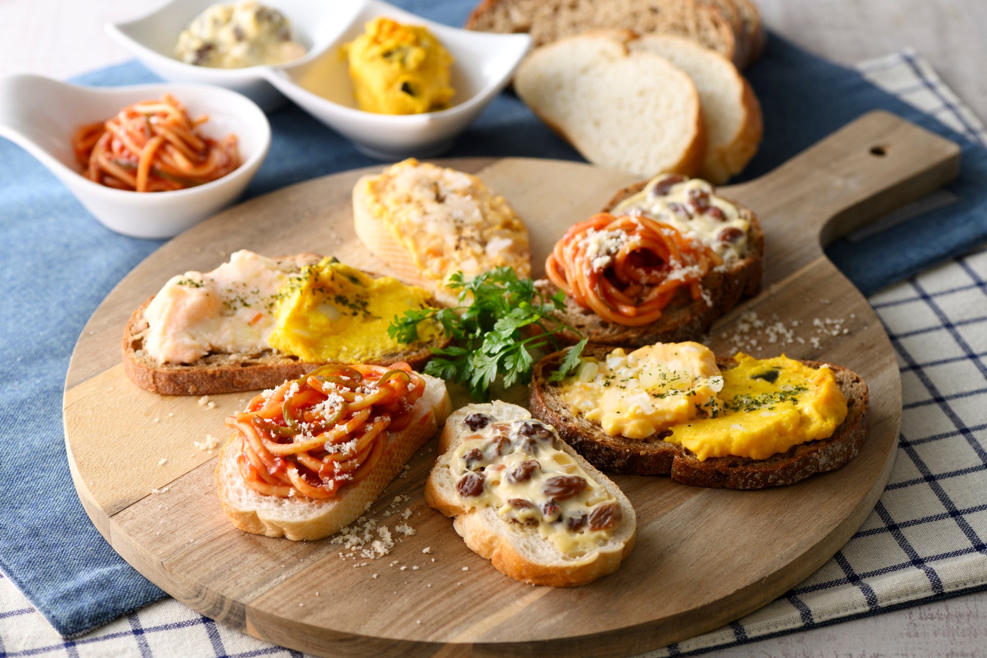 『ドライフルーツスプレッド』『冷製ナポリタン』『明太ポテトサラダ』『玉子サラダ』4種の味わいをお好きな組み合わせでお楽しみください。