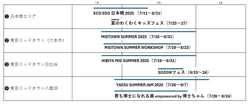 7月11日(金)の日本橋エリア「ECO EDO 日本橋2025」を皮切りに、東京ミッドタウン(六本木)「MIDTOWN SUMMER 2025」、東京ミッドタウン日比谷「HIBIYA MID SUMMER 2025」、東京ミッドタウン八重洲「YAESU SUMMER JAM 2025」がスタートします。各施設で“納涼”を体験できるコンテンツを展開し、街歩きを楽しむ仕掛けとして、スタンプを集めると各施設の商品券が抽選で当たる4エリア連動のデジタルスタンプラリーも実施します。4施設を巡りながら、それぞれの街が提案する「夏の風情」をお楽しみください。