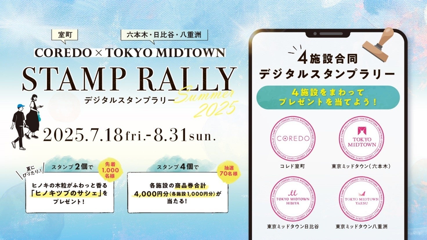 春に続き、夏もコレド室町と東京ミッドタウン(六本木・日比谷・八重洲)を巡るデジタルスタンプラリーを開催!スタンプを2つ集めると先着1,000名様に「ヒノキツブのサシェ」を、4つ全部集めると抽選で70名様に各施設の商品券合計4,000円分(各施設1,000円分)をプレゼントいたします。