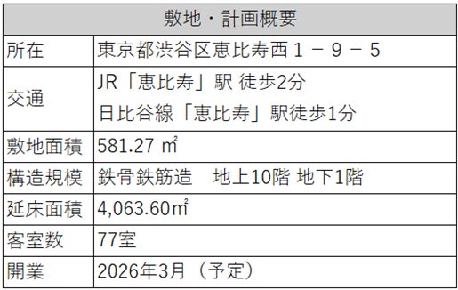 東急ステイ初のリブランドホテルとして、本ホテルは恵比寿に 2026 年 3 月に誕生します。東京メトロ日比谷線「恵比寿」駅から徒歩 1 分、JR「恵比寿」駅西口から徒歩 2 分に位置し、平均客室面積は 22 ㎡で、様々な客室タイプの全 77 室を備えます。客室タイプは、シングル、ダブル、ツインに加え、多人数客室も用意し、訪日観光客からのニーズが高いグループ利用にも対応します。客室内には東急ステイの特長であるミニキッチンや洗濯乾燥機などを設えた高い滞在機能を、またホテル全体では”街と人をつなぐ拠点“としての役割を持たせ、滞在そのものを楽しめる宿泊体験を提供いたします。